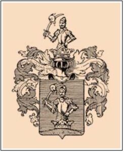 A címer. Téglalap alakú csücskös pajzs kék mezejében, a zöld pajzstalpon leveles koronából páncélos, nyílt sisakú vitéz emelkedik ki, jobbjában hátra hajló kardon török fej, bal karját csípőjén tartja. Sisak, sisakdísz: a pajzsra támaszkodó bordás fejpáncél, rajta a címerkép ismétlődik. Takaró: stilizált kékarany, pirosezüst levelek.