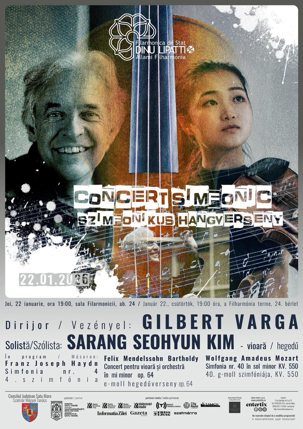 A szatmárnémeti Dinu Lipatti Filharmónia január 22-én, csütörtökön 19 órától szimfonikus hangversenyre várja a komolyzenét kedvelő szatmári közönséget, ahol a klasszikus forma tisztasága és a romantikus kifejezés intenzitása lebilincselő zenei párbeszédben találkozik, Gilbert Varga karmester vezényletével.